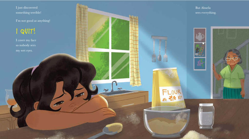 Bella wants to find out what she’s good at. But she quits everything she (barely) tries because she’s a desastre. Her somersaults are like jirafas rolling downhill, her piano playing like elephant feet. When she decides to learn how to bake with her abuela, her first attempt at dulce de leche frosting looks like cocodrilo skin. She must learn it’s okay to try again or she won’t be good at anything.