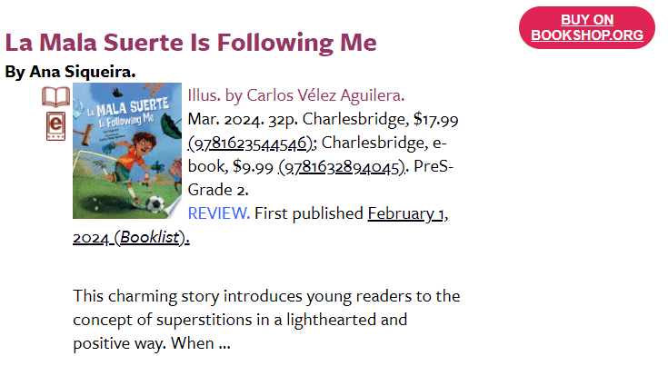 Simultaneously published in Spanish and in English with Spanish insertions, this silly and heartfelt look at superstitions will leave kids excited to get out there and make their own luck.